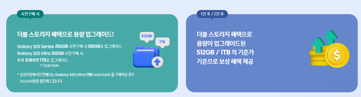 예시) Galaxy S25 256GB 사전구매 및 클럽 12개월형 가입 시 더블 스토리지 혜택으로 512GB로 업그레이드 1년 후 Galaxy S25 512GB의 기준가 1,298,000원의 50%인 649,000원 현금 지급